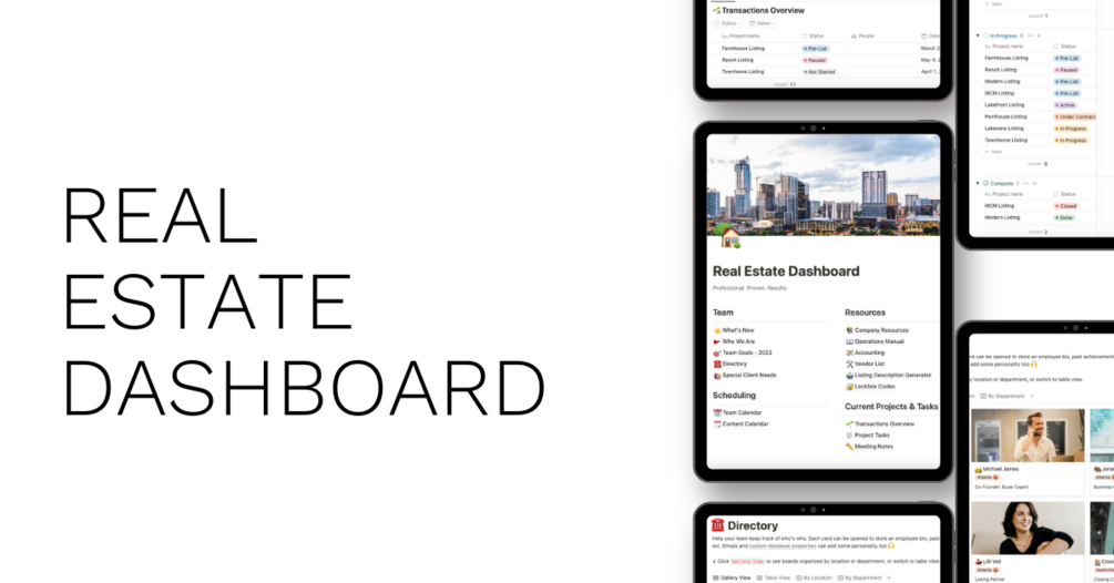 An all-in-one solution for managing your growing real estate business- 15+ pages with project management, team organization, centralized info, and MUCH more.